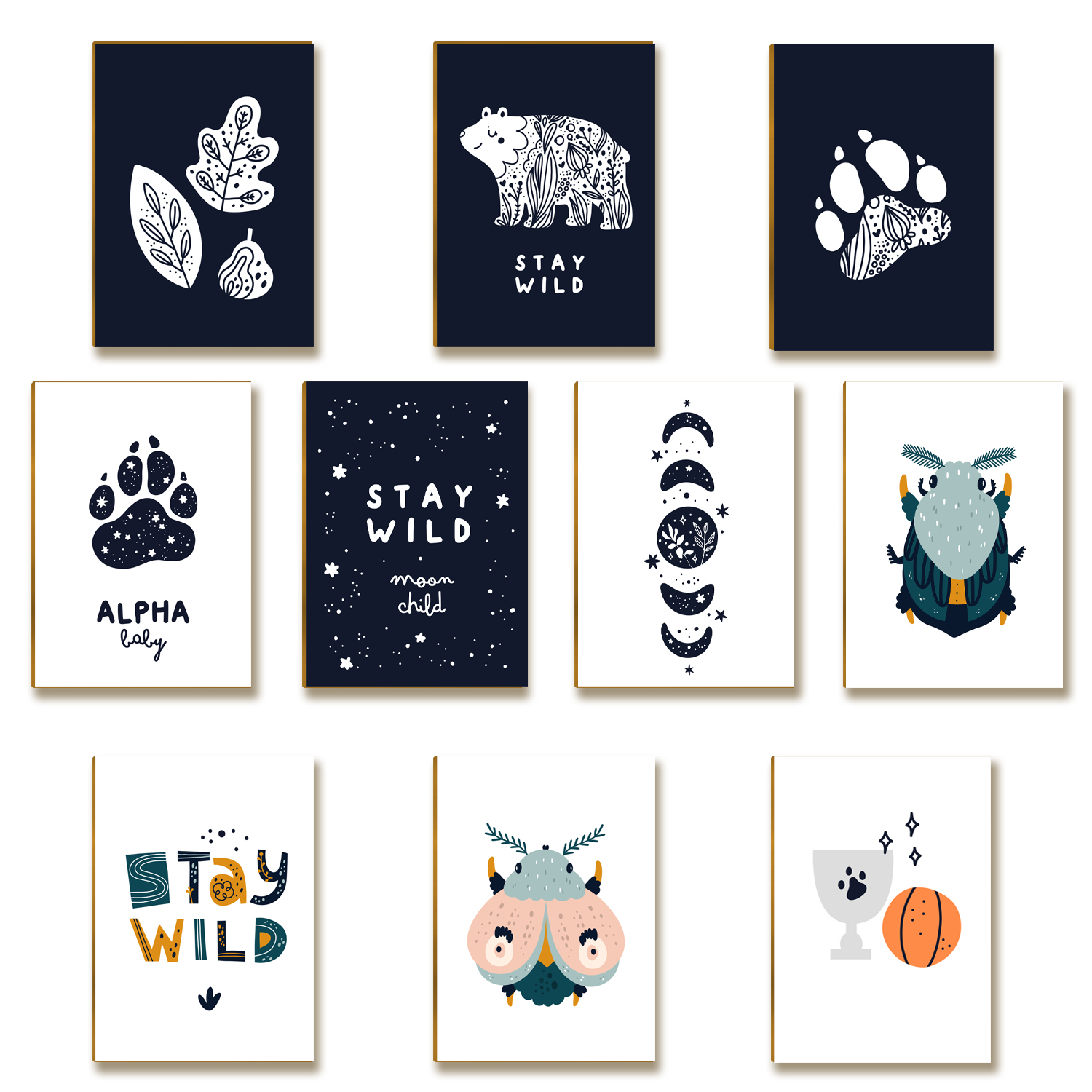 • Design Suave: tons neutros com ilustrações de lua, estrelas e frases inspiradoras.