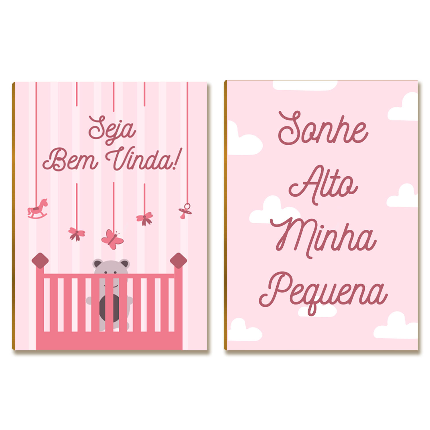 Kit 2 Placas MDF Infantil Bem-Vinda Rosa Quarto Menina A4