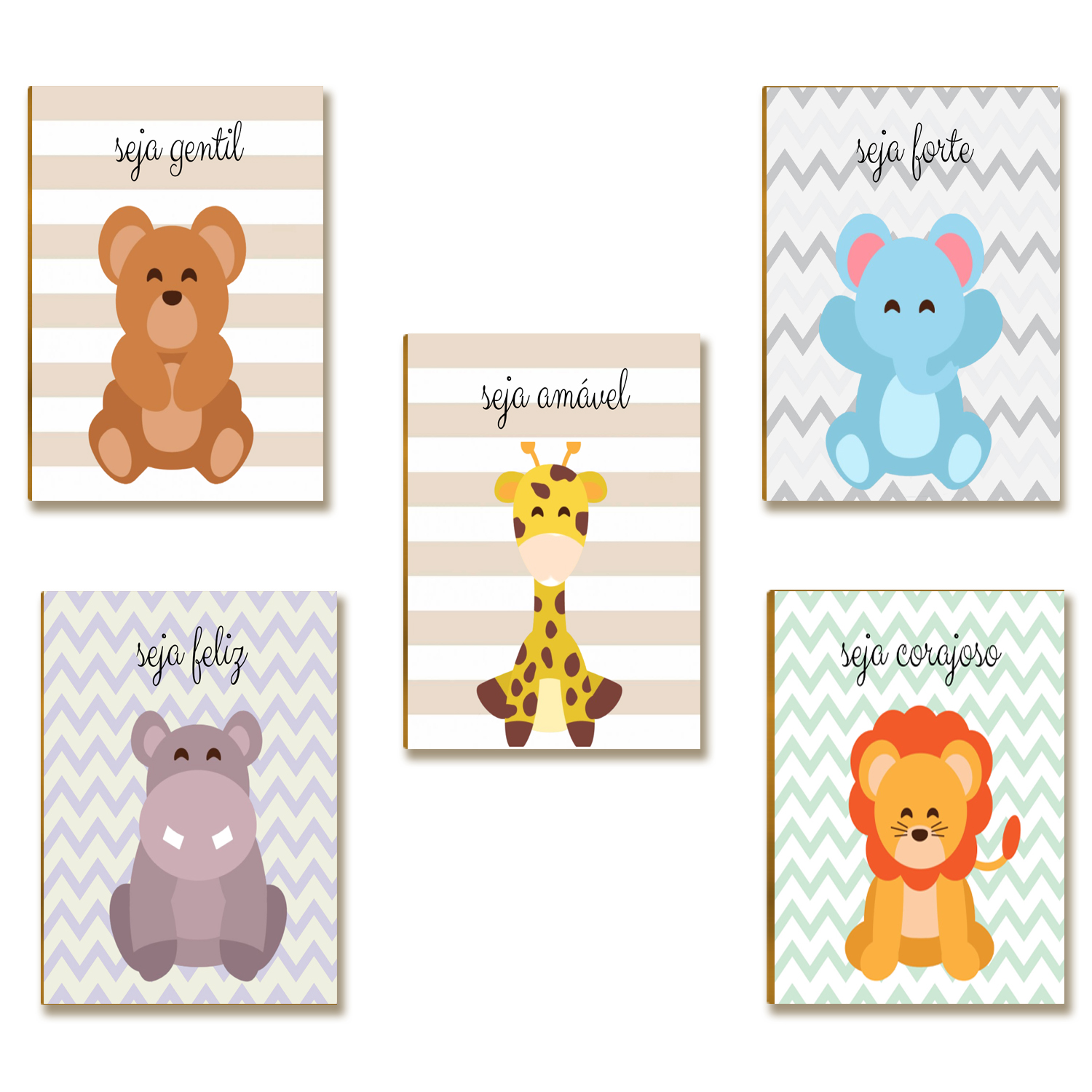 Kit 5 Placas MDF Infantil com bichinhos e mensagens Gentil, Forte, Amável, Corajoso e Feliz A4. Um conjunto motivacional para o dia a dia dos pequenos.