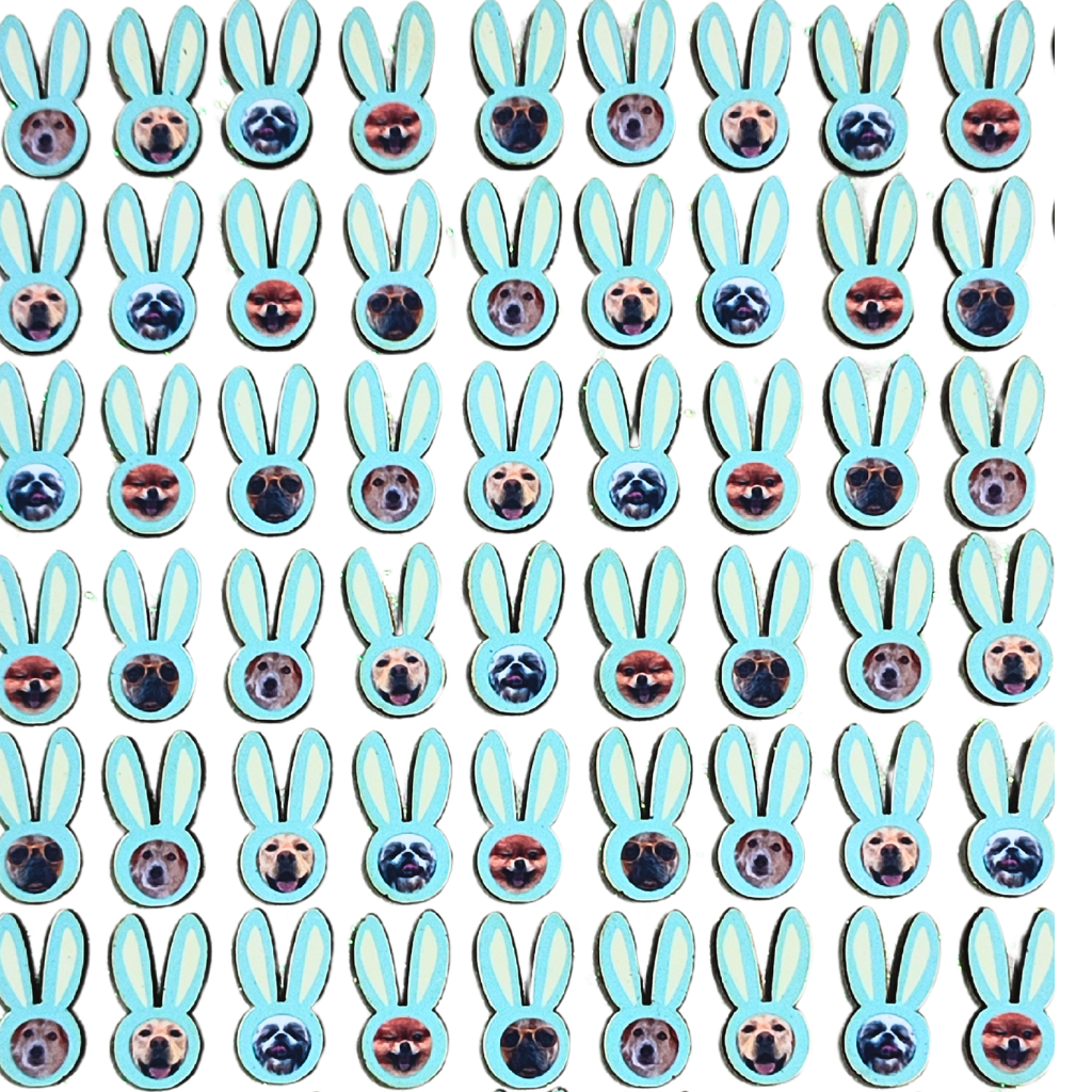 Kit de adesivos em formato de coelhinhos de Páscoa, feitos em EVA macio, próprio para uso em pets.