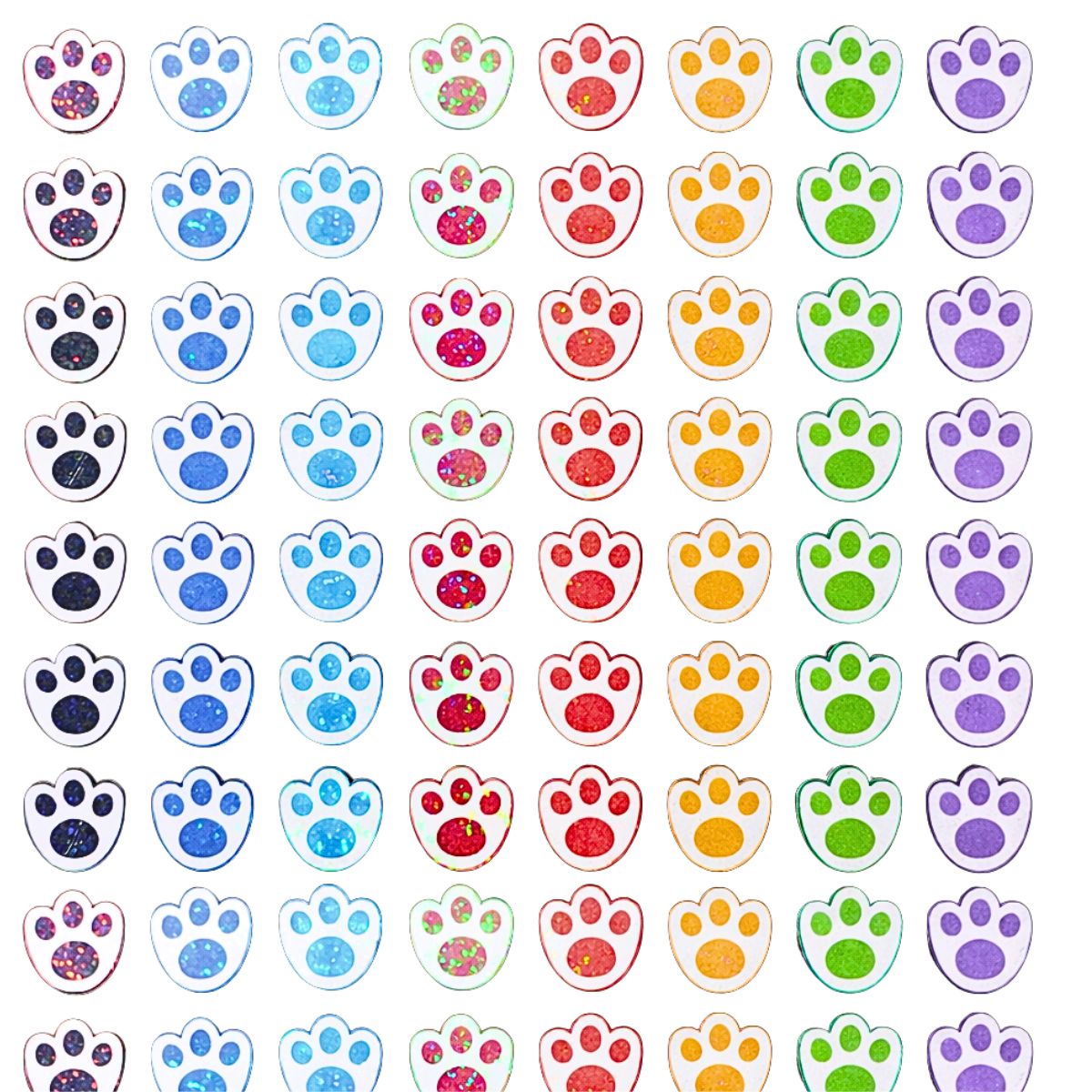 Informações técnicas: Formato: Patinha holográfica. Acabamento: Holográfico de alta qualidade. Cola: Amarela profissional, própria para pelo de pet. Aplicação: Destacar e colar.