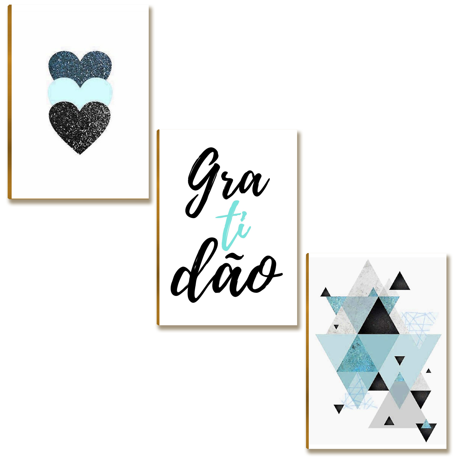 Conjunto 3 Placas MDF Gratidão Geométrico Azul Minimalista A4. Arte moderna e leve para inspirar bons sentimentos no seu lar.