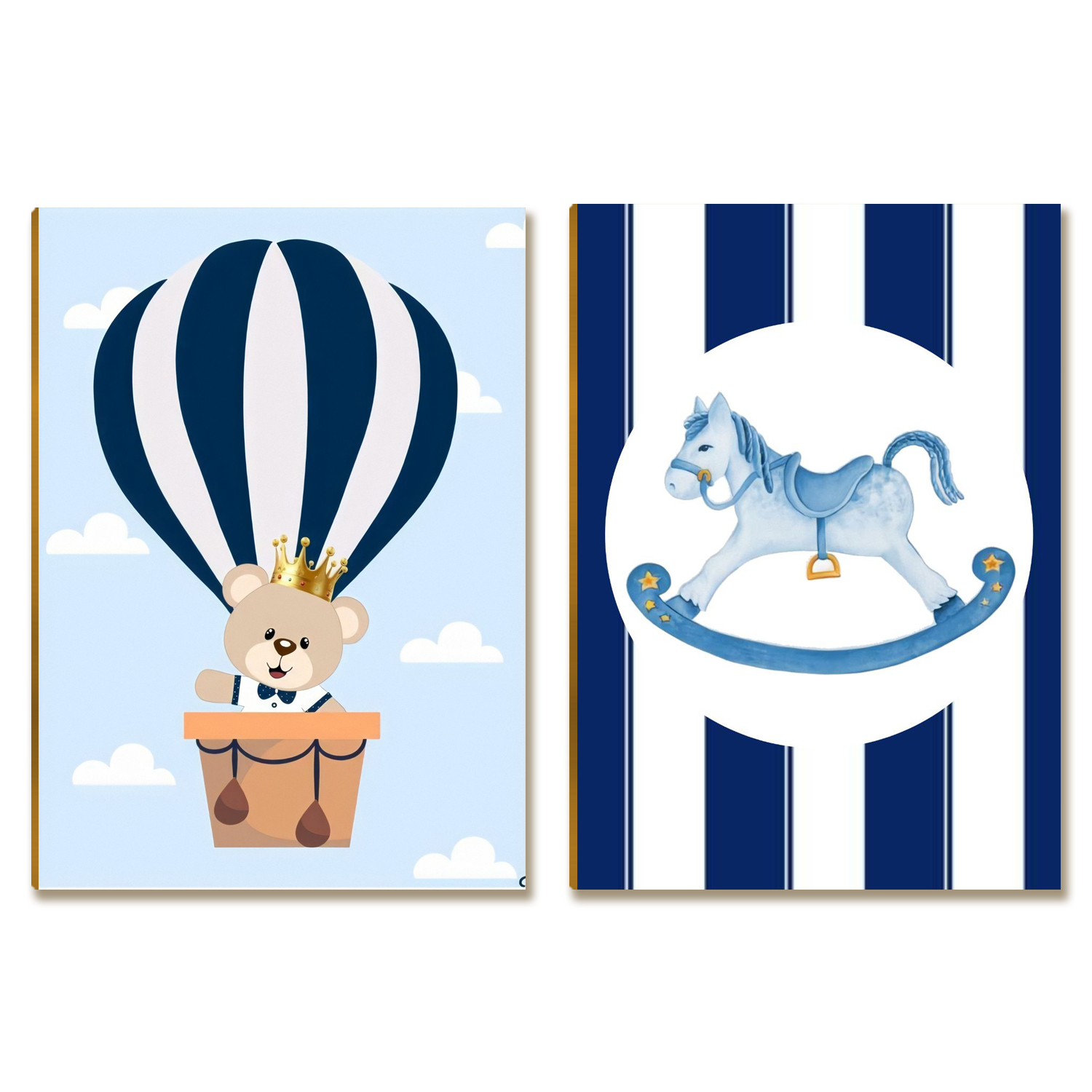 Conjunto 2 Placas MDF Infantil Ursinho Azul e Cavalinho Quarto Bebê A4. Decoração encantadora para quartos infantis e maternidades.